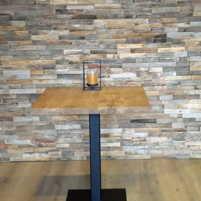 De eikenhouten tafel Brand bestaat uit een industriële tafelpoot en een eiken blad. De horeca tafel is standaard voorzien van een poedercoating in de kleur zwart. Onder de stalen poot wordt vilt geplakt, zodat krassen worden voorkomen op de vloer.