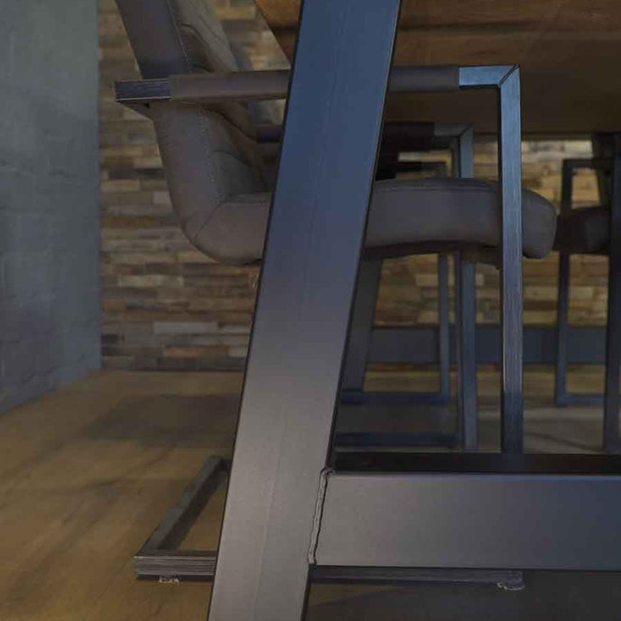 De eiken eettafel Bos heeft stalen tafelpoten bestaande uit een koker van 10 centimeter en zijn voorzien van een poedercoating. Hierdoor krijgen de stalen tafelpoten een robuust en industrieel karakter. De stalen tafelpoten hebben de vorm van een A en zijn voorzien van een zwarte poedercoating. Aan de onderkant van het stalen onderstel zijn plastic inslagdoppen gemonteerd zodat de vloer niet wordt beschadigd