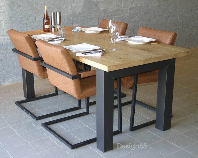 De industriële eiken eettafel Hagel wordt geleverd met tafelpoten van staal als N model. Door de speciale vormgeving kun je ook plaats nemen aan de korte kanten van de tafel. Daardoor kun je met meer dan 4 personen van deze tafel gebruik maken.