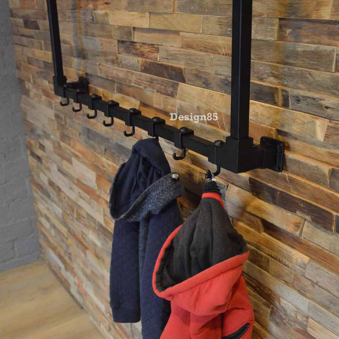 Aan de bovenste stang van de industriële kapstok Glunder kunnen kledingstukken worden geplaatst met een kledinghanger. Vanwege de diepte van 40 centimeter komen de kledingstukken niet tegen de muur aan. De onderste stang van de kapstok Glunder bevat standaard zes stuks stoere kapstokhaken. De opening van de industriële haken zitten aan de voorkant waardoor het eenvoudiger is om de jassen op te hangen. Het is mogelijk om meerdere zwarte haken te bestellen, zodat er meerdere jassen aan de onderste stang van de kapstok kan worden gehangen.