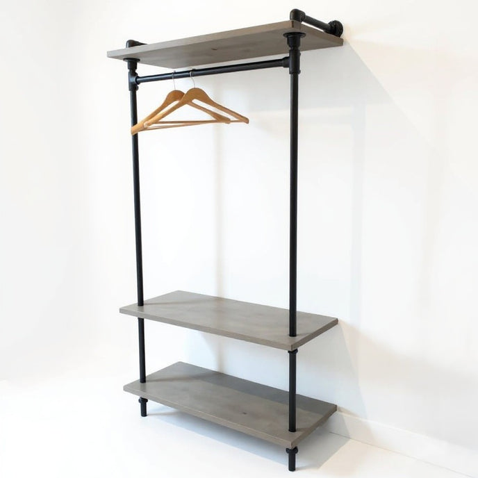 De steigerbuis kapstok Fiks heeft steigerbuizen met de kleur zwart en hebben een diameter van ø 26.9 mm. De kapstok is leverbaar in vijf verschillende breedte maten; 80, 100 (zie afbeeldingen), 120, 140 en 160 centimeter. De totale hoogte bedraagt 205 centimeter, dit is inclusief de bevestigingsplaat aan de muur. Alle schappen zijn zelf op de gewenste hoogte vast te zetten. De kapstok is voorzien van kunststof doppen om beschadiging aan de vloer tegen te gaan. De diepte van de kapstok is 40 cm, inclusief een kledinghanger is de kapstok 45 cm diep. Mocht de gewenste afmeting er niet bij staan, neem dan gerust contact met ons op want maatwerk is mogelijk.
