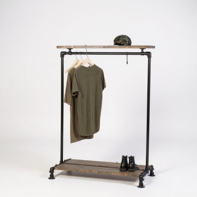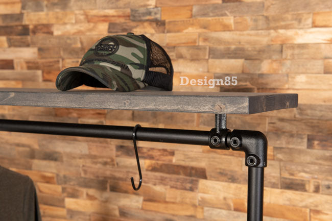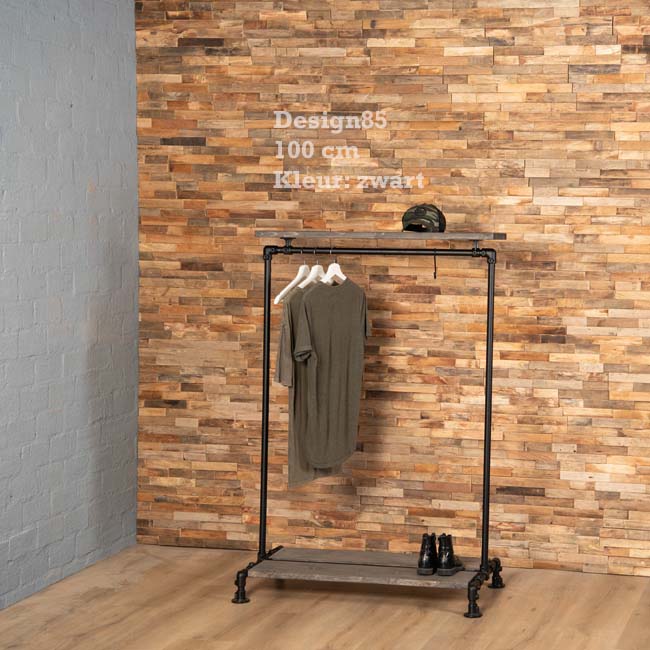 Praktisch en sterk steigerbuis kledingrek Huidig met zwarte buizen en schappen. Met diverse lepgplanken biedt het kledingrek volop ruimte voor kleding en schoenen. Het steigerbuis kledingrek is in diverse afmetingen te bestellen en de totale hoogte bedraagt 150 cm. Dit kledingrek kan op maat worden gemaakt, vraag vandaag je maatwerk kledingrek nog aan!