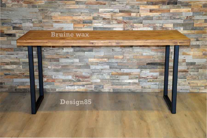 Het vintage bureau Puik heeft een afmeting van 160 x 60 x 76 centimeter (lengte x breedte x hoogte). Het bureaublad van de vuren timmerpanelen is opgedikt en heeft een totale dikte van 5.5 centimeter. De industriële poten hebben een koker van 4 x 4 centimeter en aan de onderzijde wordt er plakvilt aangebracht, zodat er geen krassen op de vloer kunnen komen. Staat de gewenste afmeting van het vintage bureau niet vermeld, neem gerust contact met ons op want iedere afmeting is mogelijk.